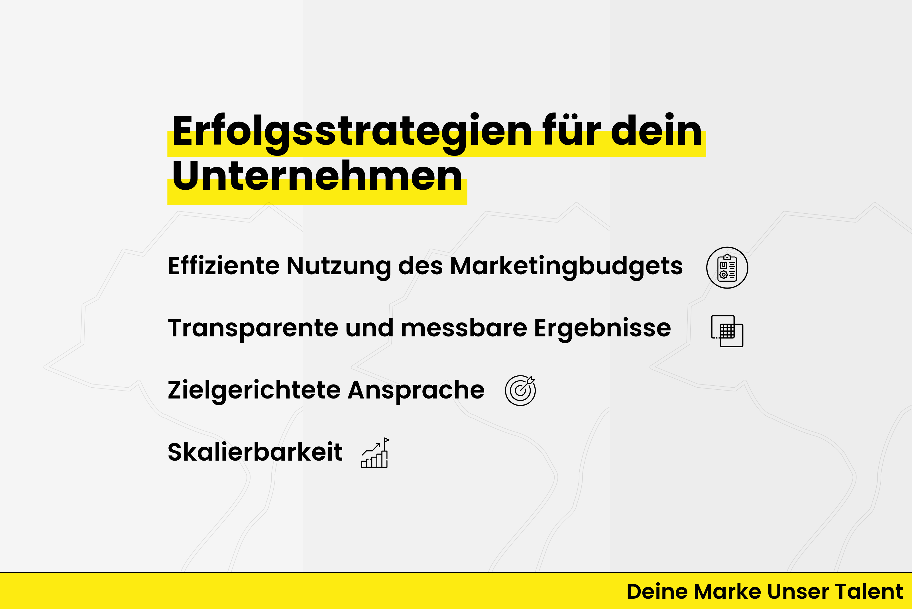 Eine klare und durchdachte Marketingstrategie ist der Schlüssel zum Erfolg. Eine Performance Marketing Agentur hilft dir, eine Strategie zu entwickeln, die auf deine spezifischen Ziele und Herausforderungen zugeschnitten ist. Sie berücksichtigt dabei alle relevanten Kanäle und Maßnahmen, um sicherzustellen, dass wir das maximale Potenzial aus deinem Marketingbudget herausholen.