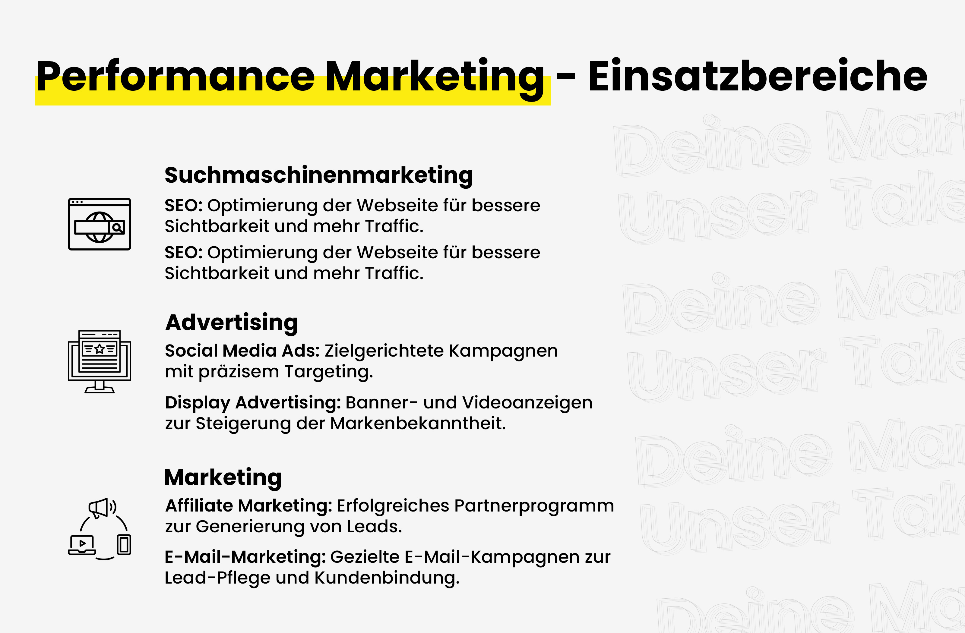 Eine Performance Marketing Agentur kommt in verschiedenen Bereichen des digitalen Marketings zum Einsatz. Sie entwickelt und implementiert maßgeschneiderte Kampagnen, die auf unterschiedliche Plattformen und Kanäle zugeschnitten sind. Hier sind einige typische Einsatzgebiete: